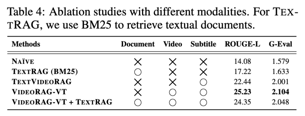 위 테이블 4는 Ablation study에 대한 결과입니다. 이를 통해, 텍스트 기반이든 비디오 코퍼스이든 외부 지식을 도입하는 것 자체가 NAIVE 베이스라인 대비 성능 향상을 가져온다는 점을 확인할 수 있습니다. 하지만 일반적인 텍스트 문서(TextRAG)와 비디오를 함께 사용하는 접근법은 오히려 성능이 하락하는 모습을 보였습니다. 이는 텍스트 지식 베이스에서 검색된 텍스트 콘텐츠가 비디오가 제공하는 정보와 중복되거나 상충되는 불필요한 세부 정보 때문일 수 있고 그 결과 이러한 중복·모순 정보가 비디오 정보를 희석시키며, VideoRAG의 효과를 오히려 떨어뜨릴 수 있다고 저자는 분석하고 있습니다.