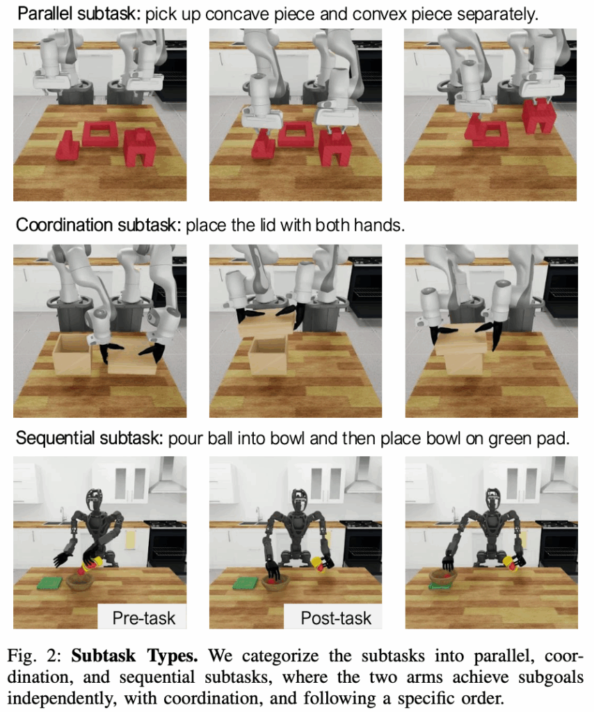 쉽게 예를 들어 pick and place task인 경우에도 pick이 먼저 수행되어야 되겠죠? 따라서 논문에서는 이러한 sequential한 subtasks를 처리하기 위해 ordering constraint mechanism을 적용했다고 합니다. subtask를 pre-subtask와 post-subtask로 나눈 후 post-subtask를 수행하는 팔이 pre-subtask를 수행하는 팔의 작업이 완료될 때까지 기다린 후 subtask를 진행한다고 합니다.