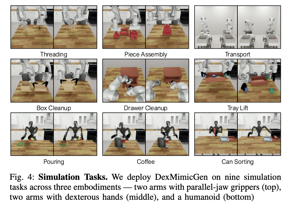이 부분에서는 위의 그림 Tray Lift task를 예로 들어서 전체적인 data generation 과정을 설명합니다. 위에서 설명한거 총정리라고 생각하시면 될 것 같습니다. 자 처음에는 human demonstration을 이용하여 source demos를 수집합니다. 그 다음 source demos는 human annotation을 통해서 subtasks로 segmentation이 됩니다.(풀어서 설명하면 하나의 task를 subtasks로 나누고 각각의 subtasks를 수행할 때 end effector의 poses들이 sequential한 집합으로 segmentation 된다는 말입니다.) 그리고 위의 그림을 보면 마지막 작업 lift tray를 할 때 coordination이 필요합니다. 이제 data generation이 시작할 때 scene은 randomized됩니다. 이 예제에서는 SE(3) transformation이 사용되는 것 같습니다. 즉 tray의 변환을 통해서 변환 행렬을 구한 후 이 변환 행렬을 가지고 엔드 이펙터의 궤적을 변환 시킵니다. 여기서 five fingers의 궤적은 replay 방식으로 생성한다고 하네요 엔드 이펙터와 상대적인 관계여서 그렇다고 합니다. 그 후 task가 성공하여야 demonstration이 생성된다고 합니다.