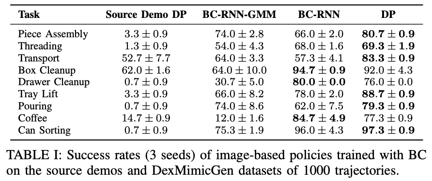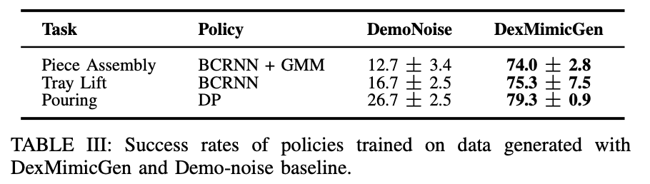 마지막으로는 이렇게 모은 40개의 데이터를 가지고 Diffusion policy를 사용해 학습한 정책과, 4개의 human demo를 가지고 학습한 정책을 비교하는 과정을 하였는데. DexMimicGen의 경우 90%의 성공률을 보였지만 4개의 human demo를 통해 학습한 정책은 0%의 성공률을 보였다고 합니다.