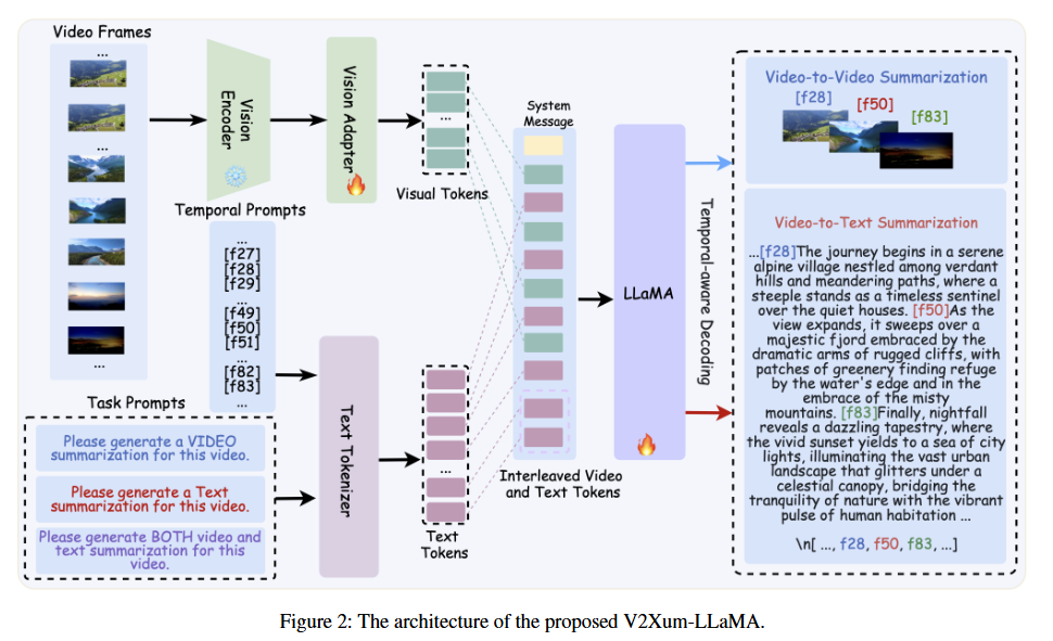 이 프레임워크는 서로 다른 형태의 요약(V2V, V2T, V2VT)을 하나의 LLM 디코더에서 통합하여 생성합니다.