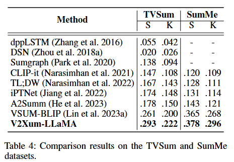 또한 TVSum과 SumMe에서도 최고의 성능을 보였습니다. 이 실험은 조금 흥미로운데, LLM 기반 모델이 전통적인 V2V 모델보다 더 강한 성능을 냈다는 것을 의미합니다. 이로써 LLM기반 요약이 비디오 요약에도 꽤 강력하게 통한다는것을 명확히 보여줍니다.