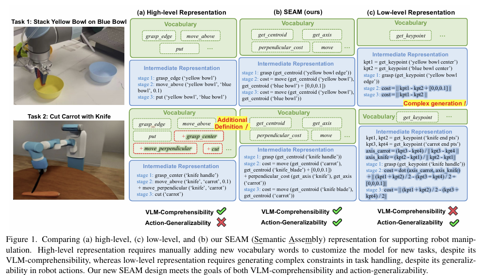 VLMs는 강인한 로봇 조작에 중요한 역할을 하지만, 사람의 지시를 행동으로 변환하는 중간 representation으로 사용하는 데 있어 VLM의 이해 능력과 일반화 능력은 trade-off 관계가 있습니다. 저자들은 context-free grammar(Context-Free Grammar, CFG는 컴퓨터 과학과 언어학에서 널리 사용되며, 특히 컴파일러 설계와 프로그래밍 언어의 문법 정의에 중요한 역할을 합니다.)에 영감을 받아 중간 표현(intermediate representation)을 어휘(vocaburary)와 문법(grammar)으로 분해하는 Semantic Assembly representation(SEAM)을 설계하였습니다. 이를 통해 풍부한 의미적으로 풍부하면서도 간결한 연산 어휘와, 다양한 unseen 작업을 처리할 수 있는 VLM 친화적인 문법을 구축할 수 있었다고 합니다. 또한, 새로운 segmentation 패러다임을 제안하여 검색 기반의 few-shot 학습 방식을 통해 물체의 조작 영역을 짧은 inference 시간으로도 효과적으로 찾을 수 있게 되었다고 합니다. 저자들은 새로운 metrics를 정의하여 action 일반화와 VLM 이해 능력을 정량적으로 평가하고자 하였으며, SEAM이 이러한 두 측면에 있어서 기존 방식보다 뛰어난 성능을 보였음을 입증하였습니다. 마지막으로 다양한 real-world 실험을 통해 다양한 세팅의 task에서 SOTA 성능을 보이는 것을 확인하였습니다.