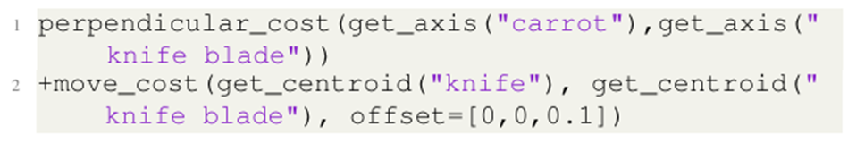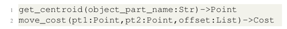 이러한 설계 원칙을 기반으로, vocabulary에 포함된 단어들은 의미론적으로 풍부하면서 인간의 자연어와 비슷하여 VLM의 가독성을 확보하였으며, 모든 단어들을 반복적인 하위 구현 세부 사항을 추상화하여, 필요한 최소한의 파라미터만 보이도록 합니다. 예를 들어, “get_axis”의 경우, PCA를 통해 축을 계산하는 내부 구현을 숨기고 입력으로 사용되는 point만을 노출하여 간결하게 표현하는 것 입니다. 이러한 방식을 통해 요소 간 중복을 최소화하여 간결성을 확보하고자 하였습니다.