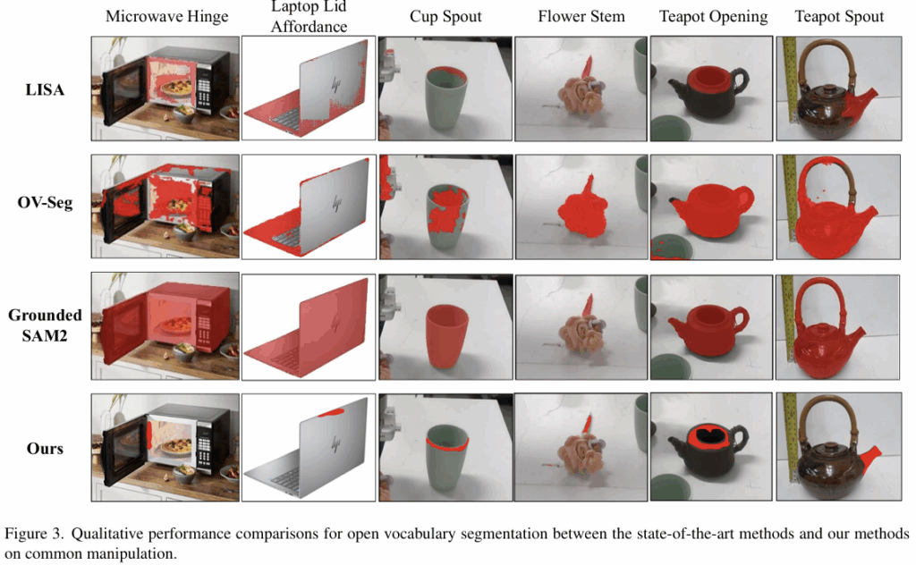 “get_axis”와 같은 \mathcal{V} 내의 단어에 대해 대상 물체 영역을 찾기 위해, 정밀하고 세밀한 open-vocabulary 방식의 segmentation이 필요합니다. 그러나 기존 연구는 정밀한 세부 부위 분할에 어려움이 있었고, 이는 위의 Figure 3에서 확인할 수 있습니다. OV-Seg와 Grounded SAM2와 같은 기존 연구는 물체 영역이 아니라 전체 영역에 집중하였으며, LISA는 hinge와 opening과 같이 세부 부위를 분할하는 데 실패하는 것을 확인하실 수 있습니다.