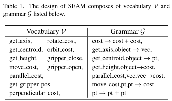 해당 연구는 이러한 CFG를 차용하여 SEAM을 설계하고, VLM을 위해 보다 직관적이고 의미론적인 인터페이스를 제공합니다. CFG의 V,\Sigma, S는 SEAM의 \mathcal{V}에 대응되며, 생성 규칙 R은 SEAM의 \mathcal{G}에 대응됩니다. 아래의 Table 1은 이에 대한 예시입니다.