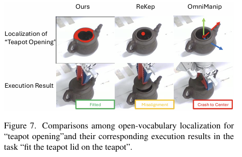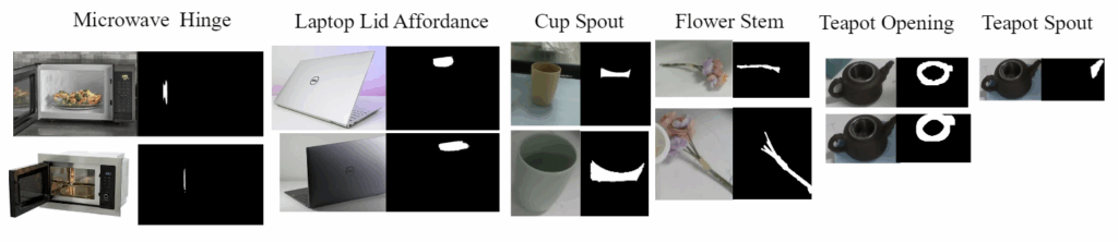 또한, 저자들은 teapot handle이나 bottle cap과 같이 특정 객체 부위와의 정밀한 상호작용이 가능하도록 하기 위해, RGB 이미지와 segmentation mask 쌍으로 구성된 open-vocabulary 이미지 데이터 베이스를 구축하여 fine-grained object part segmentation을 수행합니다. 나아가, RAG(Retrieval-augmented generation) 파이프라인에서 few-shot 학습 기반의 방식을 통해 지시문에 명시된 객체 부위를 정확하게 찾을 수 있도록 하였습니다.