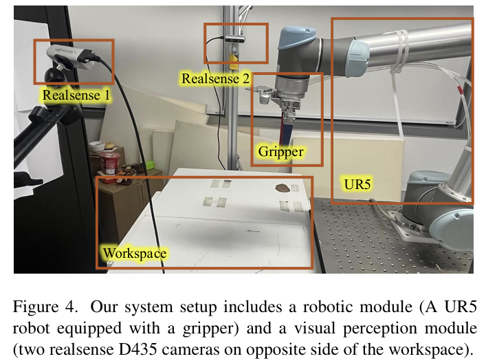 하드웨어 세팅은 위의 Figure 4에서 확인하실 수 있습니다. UR5 로봇을 이용하였으며, 서로 반대편에 2대의 Realsense D435를 배치하여 workspace 전반에 대하여 촬용할 수 있도록 하였습니다.