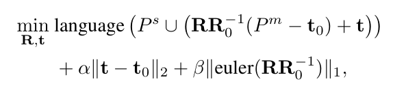 여기서 \mathbf{R}_0과 \mathbf{t}_0은 그리퍼의초기 자세를 의미하며, euler( )는 회전 행렬에서 오일러 각을 추출하는 연산자입니다. 즉, 첫번째 항은 언어 비용이 최소가 되도록 하는 것으로, 정지되어있는 P^s와 그리퍼를 따라 이동한 P^m를 모두 합쳐 cost를 계산하는 것 이며, 마지막 두 항은 정규화 항으로, 그리퍼의 이동량과 회전량이 최소가 되도록 하는 항입니다.