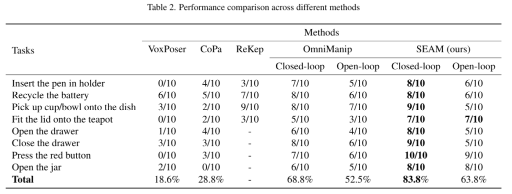 SEAM을 정량적으로 평가하기 위해 저자들은 행동 일반화 능력과 VLM의 이해 능력이라는 2가지 지표를 새롭게 정의하였으며, 실험을 통해 SEAM이 두 지표에서 모두 강력한 성능을 보였으며, 기존 SOTA 방법론 대비 real-world 로봇 조작 성능을 약 15% 향상시켜 실제 세계에서도 강인하게 작동함을 보였습니다.
