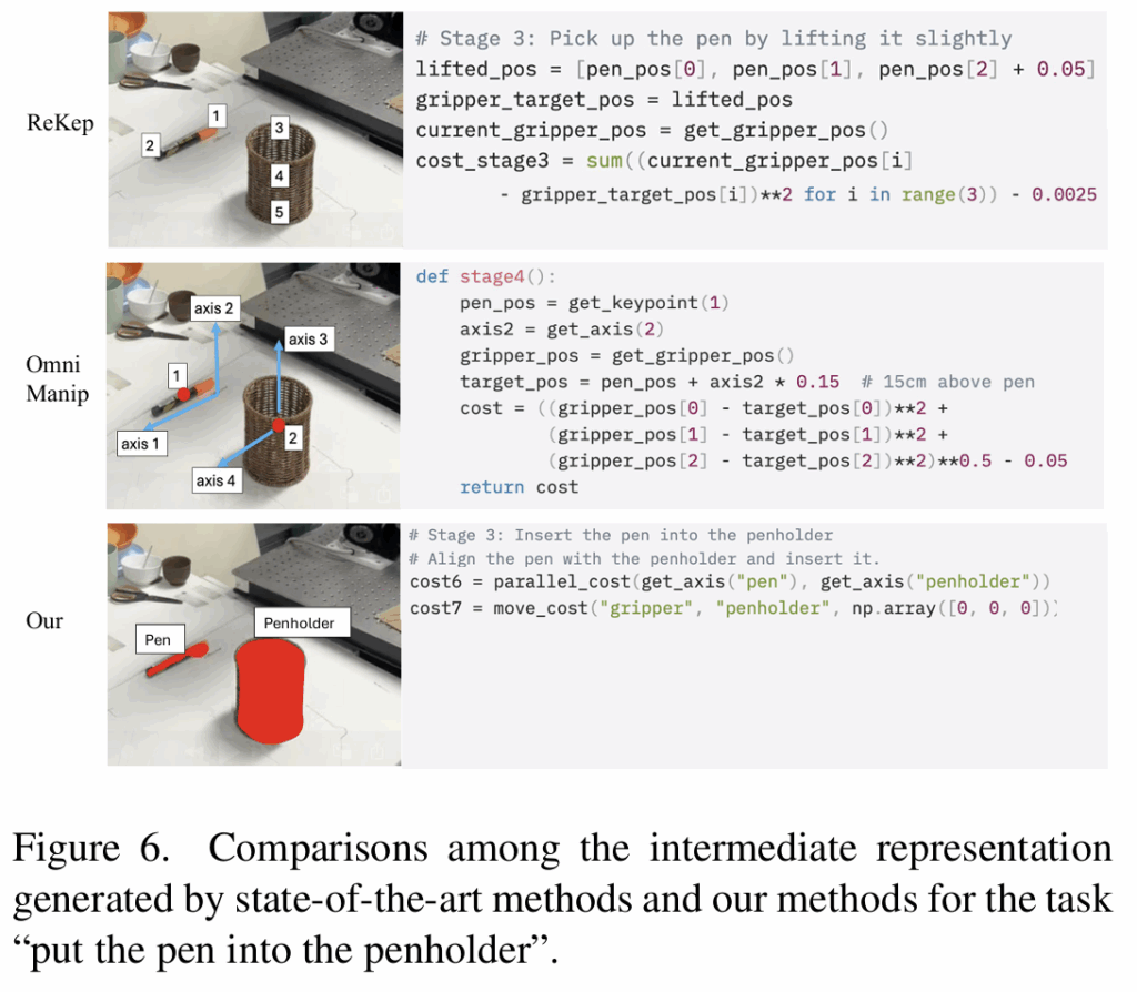 SEAM은 VLM이 이해하기 쉽고 조합 가능하도록 설계된 방식으로, Figure 6은 펜을 펜 꽂이에 넣는 작업 중 펜을 펜꽂이 위로 이동하는 단계에 대한 각 방법론들의 표현을 확인할 수 있습니다. ReKep은 이미지에서 keypiont를 선택하고 이를 기반으로 축을 계산하도록 하여 팬의 축과 펜꽂이의 축 정렬에 어려움을 겪는 것을 확인할 수 있습니다. OmniManip의 경우도 이미지에서 올바른 축을 선택하고 적절한 표현을 생성해야하므로 축 정렬에 어려움을 겪습니다. 그러나 저자들이 제안한 SEAM 방식은 어휘와 문법을 통해 방향 정렬 문제의 복잡성을 추상화하여 펜과 펜꽂이를 정렬하기 위해 쉽게 표현을 생성하도록 합니다.