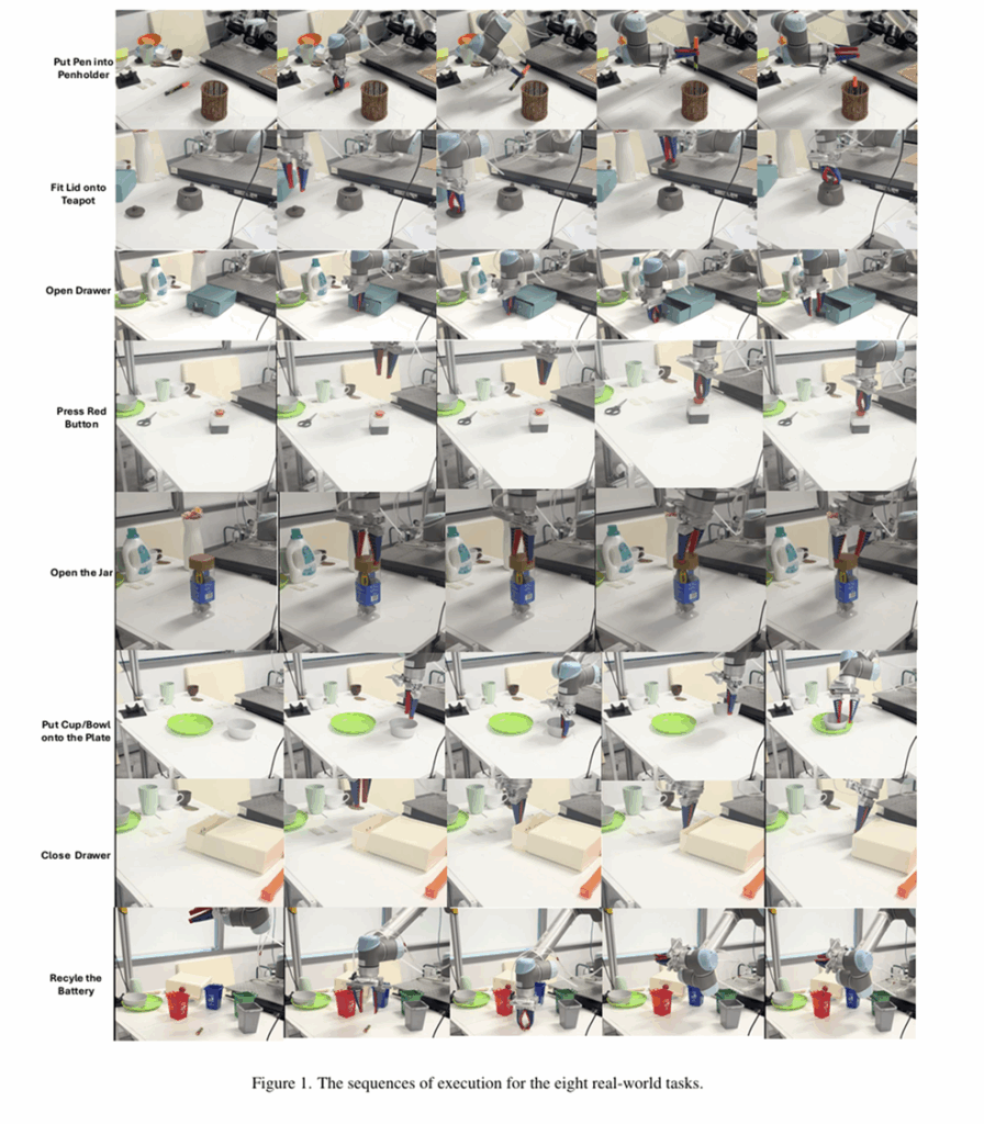 real-world에서 평가를 위해 8개의 서로 다른 task로 구성된 test set을 구축하였으며, 해당 벤치마크는 음료 따르기와 같은 rigid object 상호작용이 필요한 6가지 작업과 서랍 열기와 같이 관절 구조를 다뤄야하는 6가지 작업으로 구성됩니다. 각 작업은 10번 반복하였을 때 성공률을 지표로 사용하며, 편향을 막기 위해 object의 위치는 매번 무작위로 초기화하였다고 합니다.