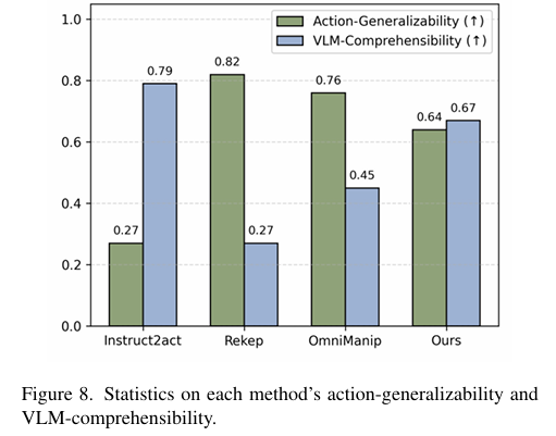 단일 로봇 팔, non-tactile, non-force-feedback 조건에서 랜덤하게 33개의 작업을 무작위로 생성하였다고 합니다. 동일한 VLM 모델인 Qwen3-VL에 해당 방법론의 프롬프트들을 제공하여 intermediate representation을 생성하도록 하였으며, 모든 작업에 대하여 실제로 검증하는 것이 노동집약적이고 사실상 불가능하므로 DeepSeek를 활용하여 실제 작업 수행에 합리적인 행동을 생성하였는 지 평가하였다고 합니다. 사실 이 부분이 받아들여질 지 모르겠습니다.. 제 생각에는 받아들여지지 않을 것 같은데요.. 개수를 줄이더라도 실제 가상환경이나 real-world로 평가를 했어야 인정이 될 것 같습니다. 많이 아쉽네요..