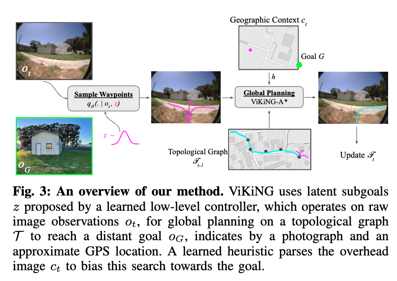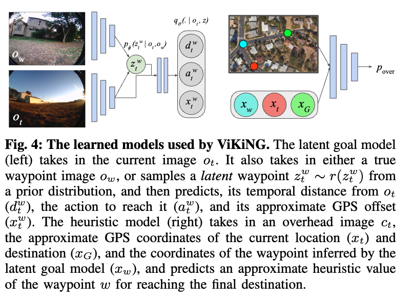 실제로 ViKiNG알고리즘은 42시간의 분량의 주행 데이터로 학습되었고 학습데이터에서 80m 보다 긴 이동 경로를 본적이 없음에도 불구하고 해당 알고리즘은 지리적 힌트 정보를 통해서 2km 이상 떨이진 목표지점을 잘 찾아가는 모습을 보였다고 합니다. 아래 (a)가 위성지도를 지리적 힌트로써 모델의 입력으로 들어가고 (b)목표지점 (c)내가 현재 보고있는 관찰 상태를 통해서 모델이 어떻게 네비게이션을 수행할지 예측하는 구조라고 보시면 됩니다.