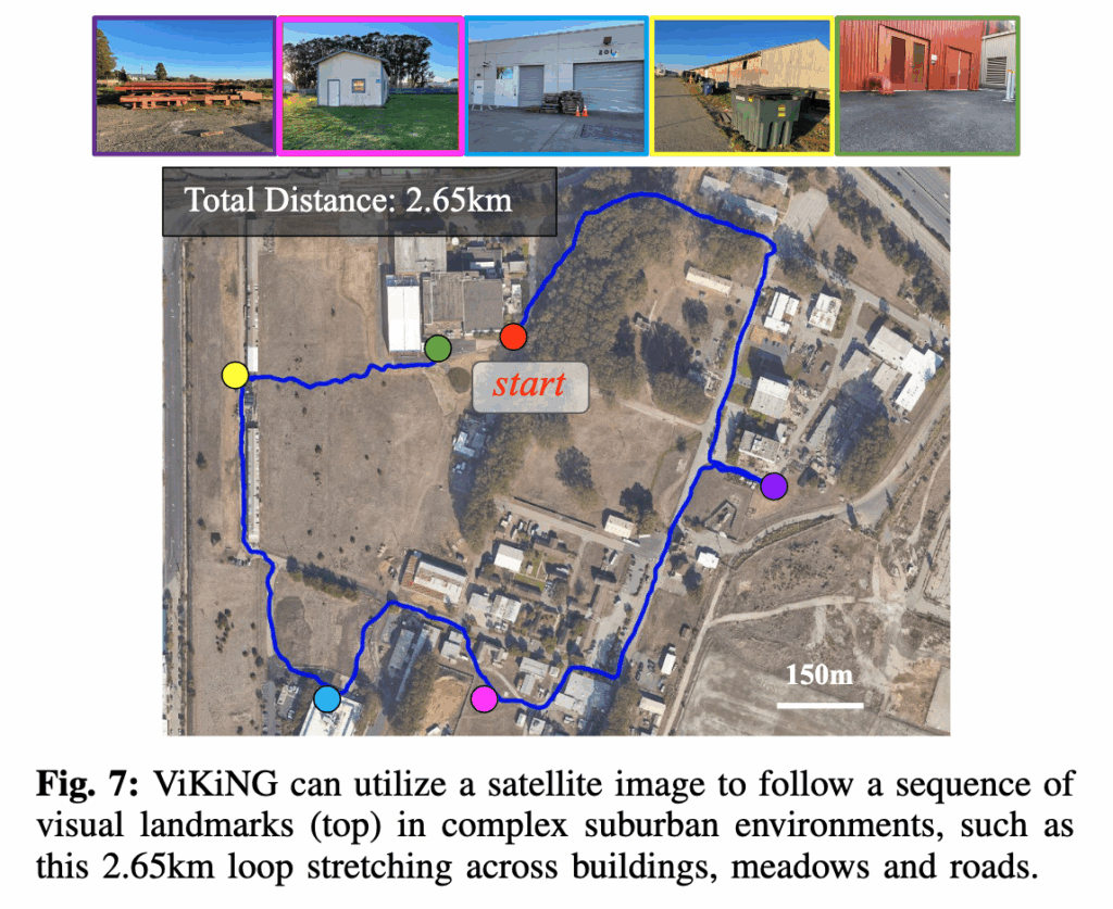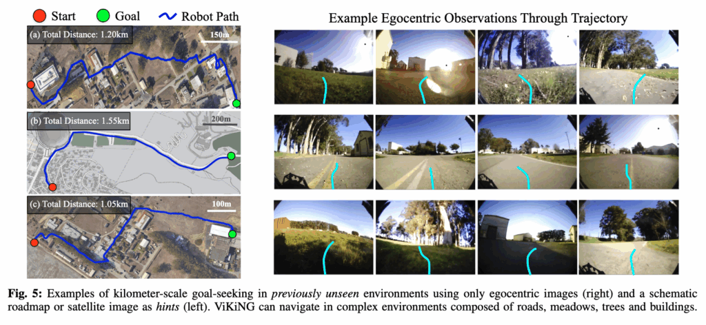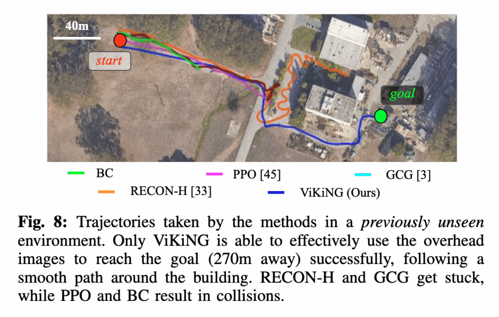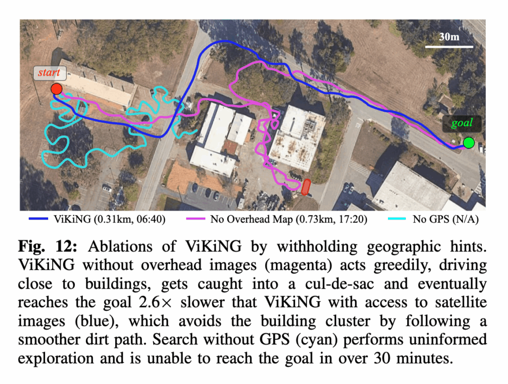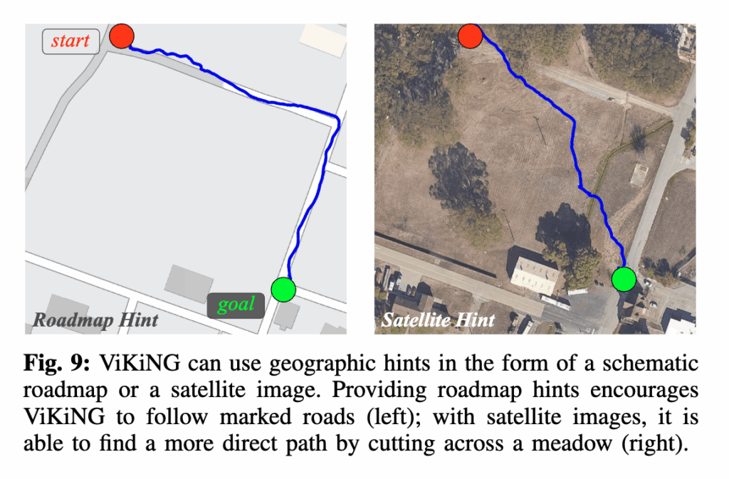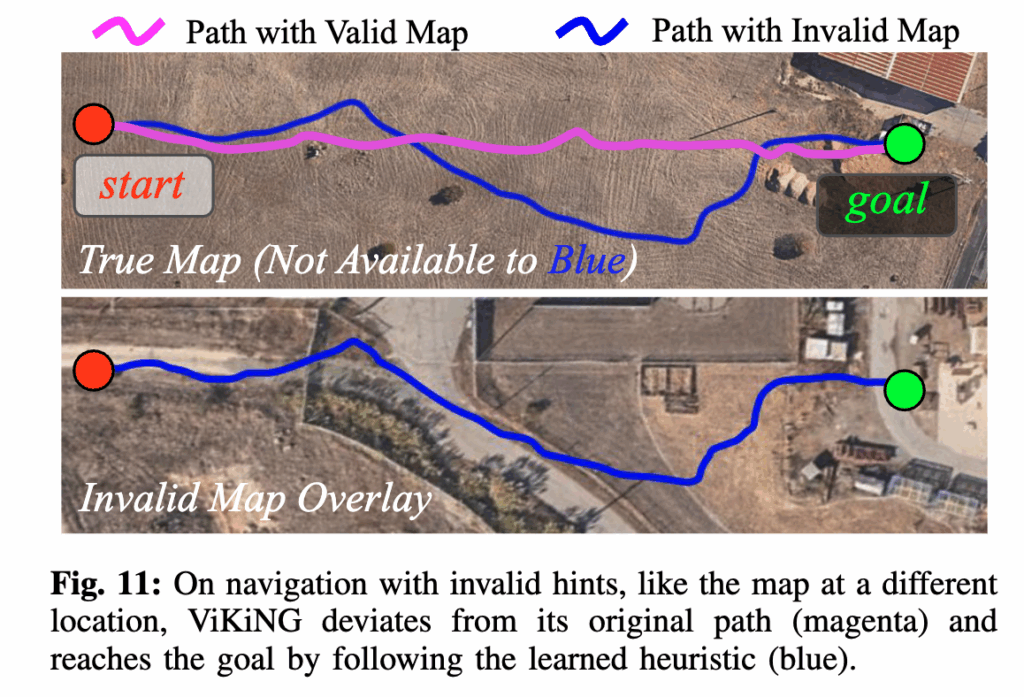 결과적으로 로봇은 실제 환경에는 없는 도로가 있다고 생각하고 원래 경로에서 벗어난 움직임을 보입니다. 근데도 목표에는 성공적으로 도달합니다. 왜냐면 잘못된 지도가 가리키는 경로가 실제로도 장애물 없는 개방된 공간 이었기 때문입니다. 이 실험은 ViKiNG이 힌트를 절대적으로 따르지 않는 것을 보여주면서 힌트가 유도하는 방향이 위험하지 않은 한에서만 가능하다는 점을 보여줍니다.