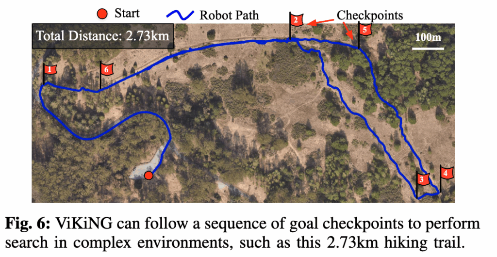 위 처럼 6개 checkpoint image와 + GPS 정보를 제공해주고 ViKiNG-A* 를 6개의 goal마다 반복 실행하였다고 합니다. 그리고 Topological graph T는 계쏙 재사용하는 방식으로 실험을 진행하였다고 합니다. 결과적으로: 로컬 충돌 회피 장거리 heuristic이 잘 결합되어 트레일을 벗어나지 않고 모든 checkpoint를 성공적으로 통과하는 모습을 보였다고 합니다.
