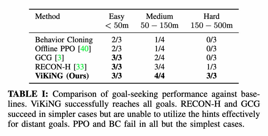 결과적으로 ViKiNG은 대부분의 환경에서 가장 높은 성공률을 기록하는 모습을 보입니다. 특히 장거리 목표 탐색에서 기존 기법들보다 압도적인 모습을 보이네요.