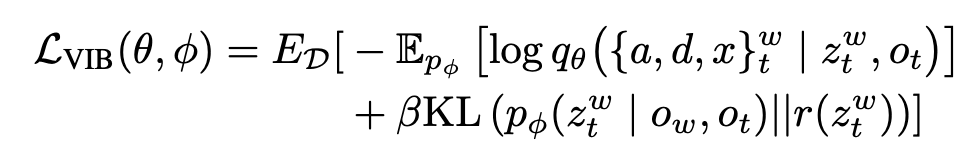 따라서 서브골 이미지가 주어지 않을 때 prior에서 샘플링된 latent waypoint z_t^w \sim r(z_t^w) 도 유효한 예측을 만들어내야하기 때문에 저자는 VIB(Variational Information Bottleneck)을 활용합니다. VIB는 KL-divergence 를 통해 encoder p_\phi(z_t^w \mid o_w, o_t)가 prior r(z_t^w) 와 분포가 가깝도록규제하는 방식이라고 하는데, 제가 이해한 바로는 학습 때에는 항상 (o_t, o_w)가 있으니까 encoder p_\phi(z_t^w \mid o_w, o_t)를 사용해 z를 샘플링하고 이 분포가 prior r(z) = \mathcal{N}(0,I)와 KL로 가까워지도록 만들면 결과적으로 encoder가 만들어내는 z들의 분포 ≈ prior 분포가 되게 될 것이고 그러면 테스트 시에는 굳이 o_w가 없어도 그냥 z \sim \mathcal{N}(0,I)에서 뽑아도 encoder가 만들었을 법한 z와 통계적으로 비슷하니까 decoder가 의미 있는 waypoint가 될 수 있다라고 이해하였는데, 자세한 내용은 논문에서 다루고 있지 않아 잘 이해했는지는 모르겠습니다…