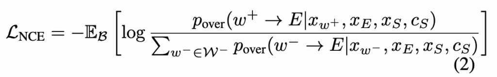결국 학습하고자 하는 확률 모델 p_{\text{over}}을 학습하기 위해 저자들은 InfoNCE 기반 contrastive learning을 사용했다고 합니다. 이 학습의 핵심 아이디어는 같은 trajectory 내에 실제로 존재했던 waypoint들을 positive w^+ 로 정의하고 전혀 다른 trajectory에서 가져온 waypoint들은 negative w^- 샘플로 만들어서 모델이 이 둘을 구분하도록 학습시키도록 하는 것입니다. 해당 InfoNCE loss는 아래 처럼 구성되어있습니다.