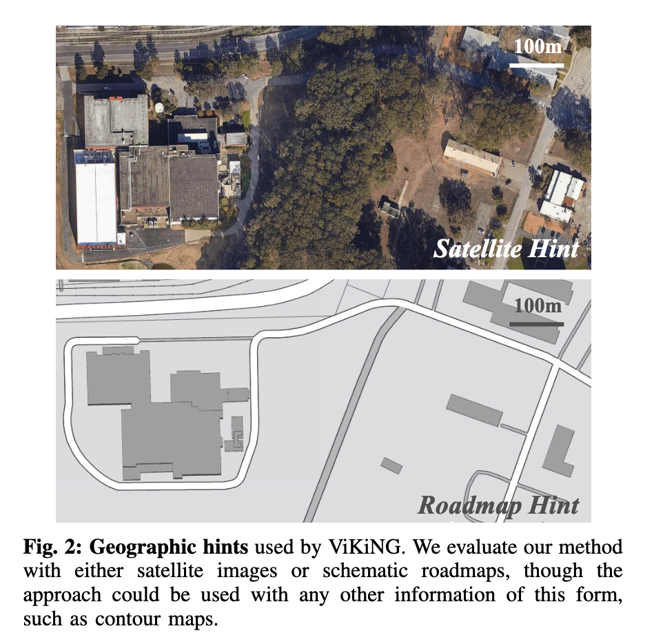저자는 메트릭 정보 없이 네비게이션을 수행하는 연구를 하지만 long horizon task를 수행하는데 있어서 완전히 geometric한 정보 없이는 힘들다고 언급합니다. 조금 큰 규모의 navigation 문제는 결국 전체적인 지형 구조가 어떻게 생겼는가?에 대한 힌트가 있어야 하는데, ViKiNG에서는 이 부분을 정확한 SLAM map 대신 지리적 힌트(geographic hints)로 대체합니다. 예를 들면 로드맵 정보라던지, GPS, 위성 이미지 등을 사용하게 되는데, 이것들을 방향성이 있는 힌트로서 단순히 어떤 스코어를 산출하는데 사용되고 실제 세부적인 이동 결정은 전적으로 카메라에서 읽은 egocentric observation기반으로 실행한다고 보시면 됩닌다. 어찌되었든 메인은 카메라에서 읽은 현재 관찰정보 만으로 네비게이션을 수행하지만 조금 장거리 이동을 위해서 저런 지리적 힌트를 사용하겠다라고 이해하시면 좋을 것 같습니다.