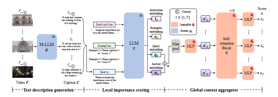 M-LLM을 사용하여 프레임을 캡션으로 변환하고 LLM이 로컬 문맥 기반으로 프레임 중요도 점수를 산정하는데 앞뒤 w개의 프레임 캡션을 포함한 문맥을 LLM에 함께 입력합니다. 함께 넣어주는 지시문으로 “중앙 프레임이 얼마나 중요한지 1~10점으로 평가하라”는 지시를 통해 각 프레임의 중요도 점수를 예측합니다.