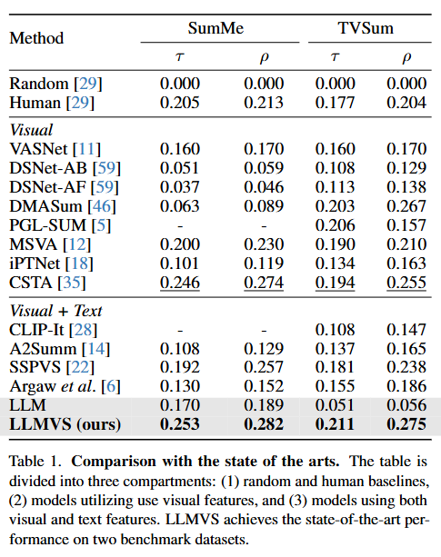 • 먼저 저자들은 비디오 요약에서 가장 널리 쓰이는 벤치마크 데이터셋인 SumMe와 TVSum을 사용하여 다른 SOTA 요약모델들과의 성능을 비교했습니다.