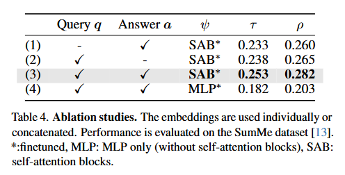 • 다음으로 LLMVS에서 가장 중요한 구성요소가 무엇인지 살펴보는 ablation studies으로 저자들이 제안한 방법에서 출력임베딩인 q,a와 3단계의 self-attention 블록ψ의 효과를 검증했다.