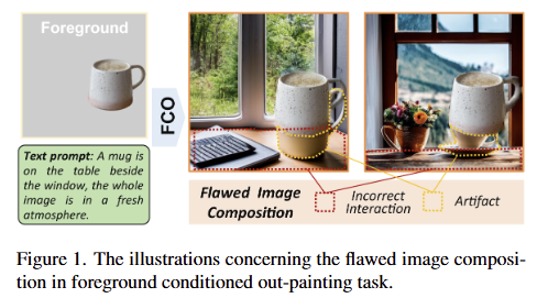 하지만 기존 FCO 기술들은 Image composition의 퀄리티 측면에서 근본적인 한계에 부딪혀 왔습니다. 즉, 생성된 배경이 주어진 전경과 자연스럽게 어우러지지 못하는 문제입니다. fig 1의 머그컵 예시와 같이 모델이 text prompt “A mug is on the table beside the window, the whole Image is in a fresh atmosphere.”이라는 프롬프트를 이해하고 생성된 fig 1의 오른쪽의 그림과 같이 부자연스러운 결과물을 보이는 경우가 많습니다. 생성된 테이블이 머그컵의 위치나 형태와 맞지 않아 incorrect interaction을 보이거나, 전경과 배경의 경계에 불필요한 artifact이 발생하는 경우가 빈번하다고 합니다.