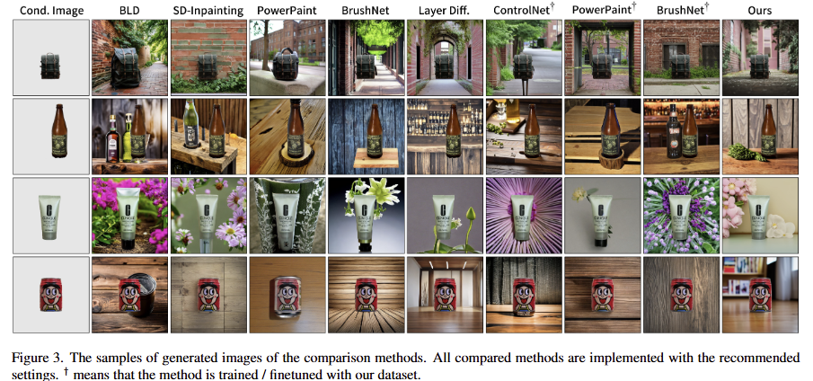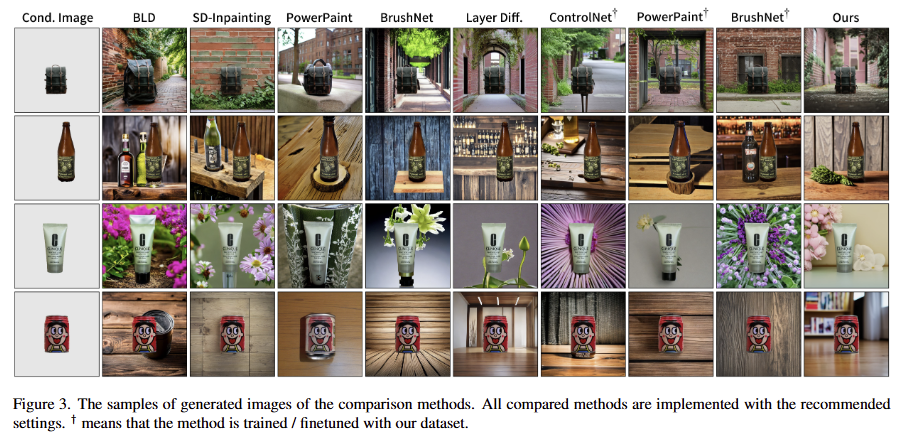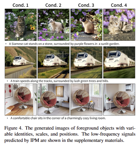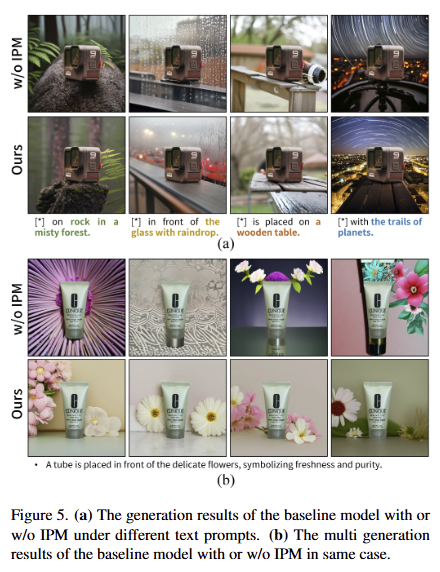 또한, IPM의 성능을 IPM의 능력을 더 보여주기 위해, 다양한 특징, 크기, 위치를 가진 전경을 condition images로 선택하고 동일한 text prompt 하에서 결과를 생성한 결과를 fig 4에서 확인 할 수 있습니다. 해당 결과로부터 제안한 기법이 다양한 시나리오에 잘 적응하며 주어진 객체와 배경 간의 합리적인 상호작용을 생성함을 보여줍니다.
