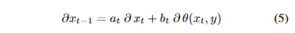 여기서 a_t, b_t 는 각각 schedule parameter를 단순화하는데 표현했으며, 자세히 풀면 다음과 같습니다. a_t = \sqrt{\alpha_{t-1} / \alpha_t} 과 b_t = \sqrt{ \alpha_{t-1} / \alpha_t - 1 }에 해당합니다. 수식 5는 diffusion reward의 단점을 드러낸다고 합니다. 그래디언트의 전달이 reward model를 반복적으로 통과해야만 한다는 겁니다.