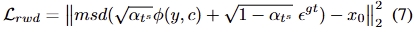 Inversion process의 결과를 기반으로, signal과 random noise에 대한 GT를 다음과 같이 얻을 수 있습니다. \tilde{x}^{gt}_0 = \sqrt{ 1 / \alpha{t^s} } x_{t^s} - \sqrt{ 1 / \alpha_{t^s} - 1 } \theta(x_t, y), \epsilon_{gt} = \theta(x_t, y) . 여기서 θ는 사전학습된 diffusion model을 나타냅니다. \tilde{x}^{gt}_0 는 IPM의 학습을 지도하기 위한 라벨로 사용되며, 이를 위한 loss는 다음과 같습니다.