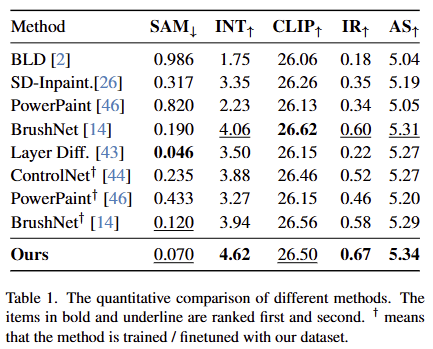 전반적인 실험 결과는 fig 3과 tab 1에서 확인 가능합니다. 실험적인 결과, 대부분의 메트릭에서 가장 좋은 결과를 보여줍니다. SAM 지표에서는 Layer Diff가 더 좋은 결과를 보여주지만, 다른 지표에서는 높은 수치로 우세한 결과를 보여주면서 더 자연스러운 결과를 입증한다고 합니다. CLIP에서는 BrushNet을 이은 2위에 해당합니다. 이는 BrushNet이 120m image를 가진 LAION-Aesthetic로 학습했기 때문에 text-image alginment에 대해서는 우세한 결과를 보인 것이라고 저자는 주장합니다. 정석적인 결과에서는 다른 기법 대비 우세한 결과를 보여줍니다.