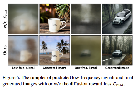 Ablation Study for Lrwd. tab 2에서 보이는 바와 같이 diffusion reward supervision은 artifact 억제에 이점을 보입니다. 해당 기능을 제외하면 AS 같은 영상 품질과 관련된 지표에서 하락하는 경향을 보입니다. 이러한 결과는 IPM이 예측한 저주파 신호의 품질과 상관관계를 가진다고 볼 수 있습니다. 저자는 이를 입증하기 위해서 fig 6을 시각화한 결과를 보여줍니다. 실험적인 결과, 해당 손실 함수를 포함했을 때, 디테일이 향상되는 결과를 보여줍니다.