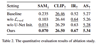 (3) Image Quality. Aesthetic Score (AS), Image Reward (IR) <- 이는 평가 모델은 human preference datasets으로 학습되었으며, 수치가 높을 수록 사람의 선호도가 높다고 간주한다고 합니다.