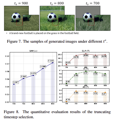 ts 값이 작을수록(후기 단계에 가까울수록) IPM이 예측해야 할 주파수 대역은 더 넓어지고, 이미 많은 디테일이 포함된 신호를 다루게 됩니다. 이러한 경우에는 그럴싸하게 재구성하는 구간이 적어져 fig 7의 오른쪽과 같이 배경이 비교적 단순화되는 현상이 발생합니다. 이러한 경향은 fig 8에서 CLIP, IR, AS와 같이 의미론적인 영역과 영상 품질 성능이 하락되는 결과를 보여줍니다.