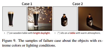 주어진 전경 객체가 극단적인 색상이나 조명 조건을 가지고 있을 때, 배경 생성의 background controllability이 현저하게 떨어지는 문제가 있다고 합니다. fig 9의 왼쪽과 같이 전경과 배경이 동일한 색상을 따라가면서 배경을 생성하는 문제가 있으며, fig 9의 오른쪽과 같이 배경 생성에 실패하는 결과를 보였다고 합니다.