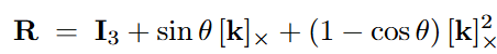 이후 시뮬레이션 상의 카메라의 위치 (extrinsic)을 정하기 위해 저자들은 supported plane 개념을 가지고 scene을 정합했습니다. 예를 들어 장면이 탁상 위라면 책상 상판이, 바닥 위라면 바닥면이 지지 평면입니다. 로봇 작업에서 이 지지면은 항상 중력의 방향과 수직이라고 가정할 수 있습니다. 먼저 배경의 pointcloud에서 바닥점 과평면 추정 알고리즘을 적용해 바닥 또는 책상 등 평평한 지지면의 법선 벡터n을 추출합니다. 그리고 n을 world 좌표(시뮬레이션)의 z축 으로 정렬하는 회전 행렬 R을 계산합니다. 이는 Rodrigues 공식을 통해 n을 단위 벡터z=[0,0,1]^T로 회전시키는 회전으로 다음과 같이 표기됩니다.