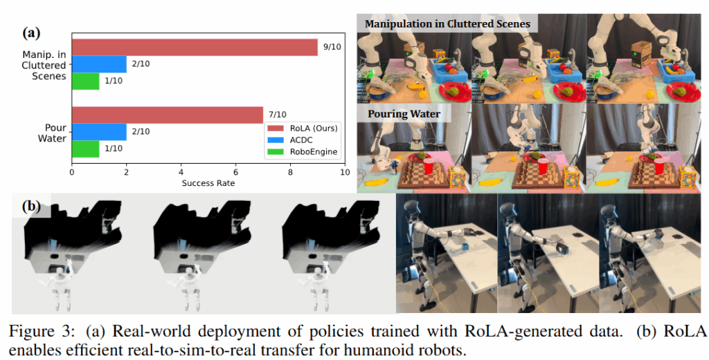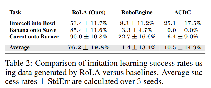 RoLA로 생성한 로봇 학습 데이터의 품질을 평가하기 위해, 모방 학습 환경에서 기존 기법들과 비교하였습니다. 세 가지 매니퓰레이션 과제에 대하여, 서로 다른 데이터 소스로 학습한 정책들의 성공률을 비교했습니다. 비교 대상은 ACDC (digital cousin)과 RoboEngine입니다. 각 방법으로 과제당 200개의 데모를 만들고 동일한 방법으로 정책을 학습한 뒤, 시뮬레이터에서 성능을 평가하였습니다. Table 2를 보면 RoLA가 모든 과제에서 높은 성능을 보여줍니다. 특이한게 바나나를 stove에 올리는 task의 경우 RoLA 데이터로 학습한 정책은 85.4% 성공률을 기록한 반면, RoboEngine 기반은 3.3%, ACDC 기반은 0%를 보여주었는데, acdc의 경우 검색 대상 데이터셋에 바나나가 없나..? 싶었습니다. 저자들은 RoLA가 복원한 물리 장면에서 수집한 시연 데이터가, 기존의 데이터에서의 검색 또는 픽셀 편집 기반 데이터보다 훨씬 물리적으로 정확하고 학습에 유용하기 때문이라고 합니다.