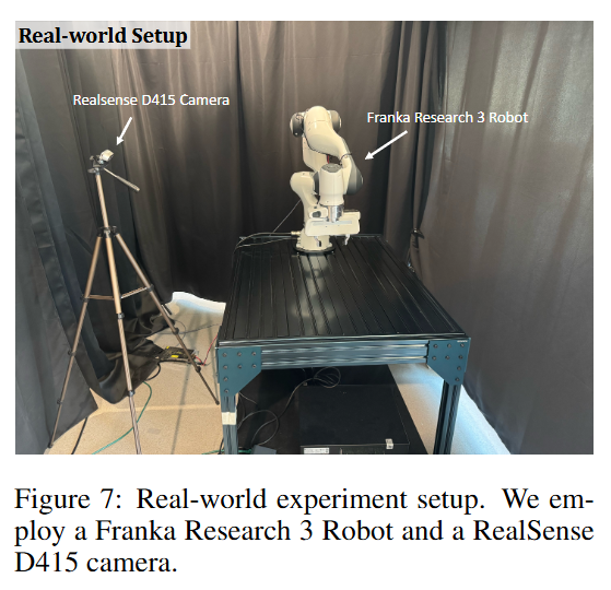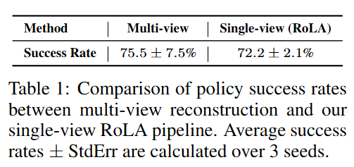 단일 이미지만으로 복원한 장면이 정확한 물리 특성을 재현하는지 검증하기 위해, RoLA와 멀티뷰 3D 복원 기법을 비교하는 실험을 수행했습니다. 바나나를 집어 stovetop 에 두기에 대해, 한 방법은 멀티뷰 카메라로 장면을 스캔하여 디지털 트윈을 만들고, 다른 하나는 RoLA의 단일 이미지 파이프라인으로 장면을 복원했습니다. 두 환경 모두에서 200개의 로봇 데모를 수집한 뒤 Diffusion Policy를 학습시켜 현실에서 평가했습니다. Table 1의 결과를 보면, 멀티뷰 방식의 정책 성공률이 약 75.5%, RoLA 단일뷰 방식은 72.2%로 거의 유사한 수준이며, 이는 단일 이미지로도 멀티뷰에 필적하는 현실감 있는 로봇 학습 환경을 구축할 수 있음을 보여주었습니다. 단일 이미지만으로 나온 성능임을 보면 요즘 foundation model들의 성능에 감탄하게 되고, monocular depth estimation 연구들의 연구 가치도 드러나는 부분이 아닐까,, 싶습니다.