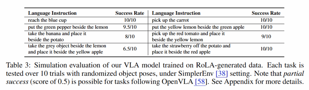 저자들은 더 나아가 SimplerEnv에서 작동할 수 있는 VLA를 학습시키기 위해 RoLA를 활용해 6만개의 시연 데이터를 수집해 Qwen 2.5를 VLM 백본으로 사용하는 VLA를 학습시켰다고 합니다. 해당 환경에서 다음과 같은 success rate를 얻을 수 있었다고 합니다. 다만 이는 sim to real gap이 풀리지 않은 부분이라 현실에서 평가하지 않은것은 조금 아쉽지 않나.. 싶습니다.