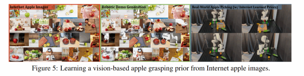 2. Figure5가 말씀하신 것에 대한 정성적인 결과입니다. 좌측에 보이는 다양한 인터넷 이미지들 기반으로 visuomotor policy를 학습한 후 기존 방법론들과 정량적인 평가를 진행했을떄도 우수한 결과를 얻었는데, 해당 실험이 의미하는 것이 “환경이 틀어져도 기존 시뮬레이션 기반 데이터 수집 방법론들보다 우수하다”로 생각하시면 될 것 같습니다.