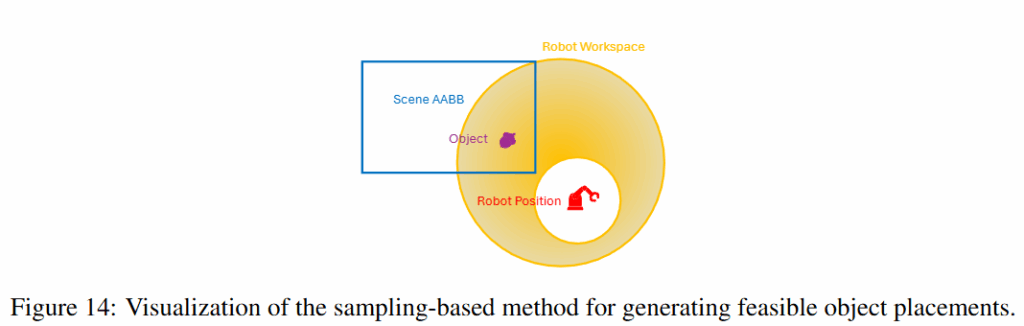 이제 만들어진 scene에 로봇을 두어야 하는데요, 위와 같이 로봇의 work space를 3D shell 모양으로 근사한 다음, 해당 영역이 작업 영역의 전체 scene의 AABB를 덮도록 베이스 위치들을 여러군데 정해서 무작위로 샘플링 해준다고 합니다. 해당 위치들 중 로봇이 기존 배경이나 객체와 collision이 일어나는 배치들은 필터링 하고, 그렇지 않은 영역들에 대해서 다양한 로봇 배치를 진행한다고 합니다. 이렇게 완성된 scene에서 시뮬레이션 데이터를 취득합니다.