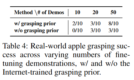 인터넷 이미지만을 가지고도 학습이 가능한가?에 대해서도 평가를 진행했는데, 다음과 같이 다양한 이미지 데이터로부터 사과를 집는 action을 학습해 아래 table4와 같은 결과를 보여주었습니다. 앞서 언급했던 grasping pose 추론 모듈을 활용했을 때 훨씬 더 성능이 좋아졌다고 합니다.
