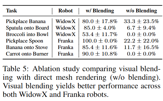 논문에도 한 문장으로 끝났는데요, 다양한 로봇 세팅에서 visual blending이 있을 때 훨씬 더 좋은 성능을 보여주었다고 합니다.