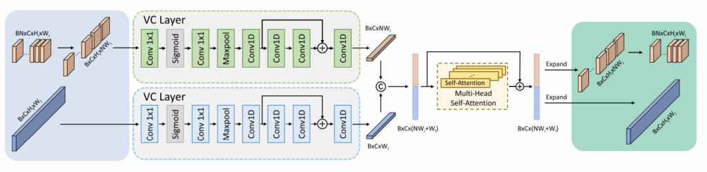 이 논문의 핵심인 VCTF 모듈이며, 구조는 위 그림과 같습니다. 저자는 Transformer의 Self-attention을 쓰고 싶은데, 그냥 쓰면 연산량이 너무 많으니 “수직 압축(Vertical Compression)” 이라는 아이디어를 도입합니다. 동작 방식에 대한 설명은 아래와 같습니다.