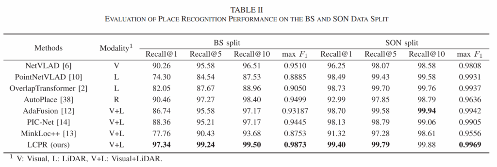 저자는 nuScenes 데이터셋에서 실험을 진행했습니다. 위 표를 보면, LCPR이 기존 SOTA인 MinkLoc++, PIC-Net, AdaFusion 등을 모두 제치고 Recall@1 성능 97.34% (BS split)를 달성했습니다. 데이터셋이 꽤 복잡한 도심 환경임에도 불구하고 성능이 잘 나오는 것을 확인할 수 있습니다. 또한, 당연한 말이긴 하겠지만 single-modality인 Overlap Transformer나 NetVLAD보다 월등히 높습니다.
