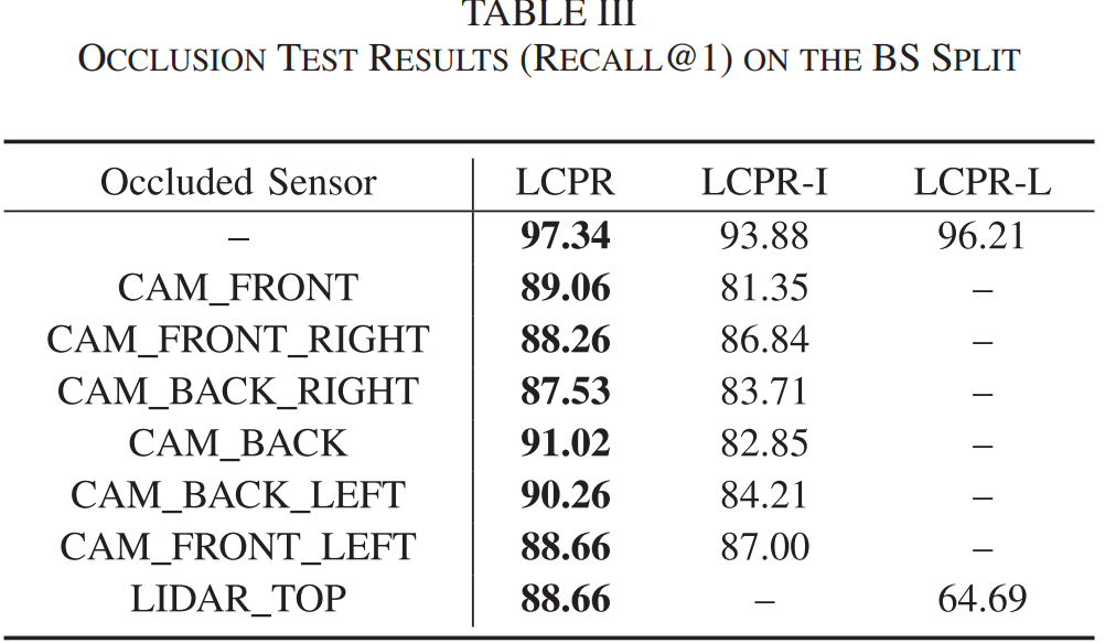 또한 저자는 위 표를 통해 센서를 하나씩 occlusion 시켰을때의 recall 성능을 리포팅합니다.