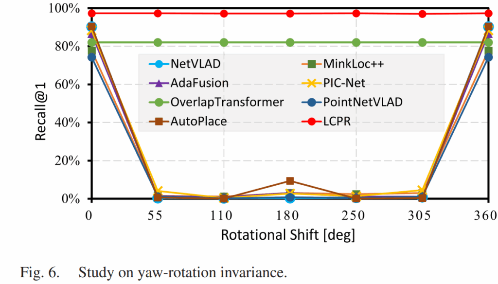 또한 위 figure를 통해 yaw 각도를 0도~360도로 돌려가면서의 성능을 테스트하고 있습니다. 아무래도 360도 방향으로 파노라마틱하게 feature 를 펼쳐서 그런지, 타 방법론들이 성능이 0으로 곤두박질 치는데에 반해 LCPR 의 경우는 성능을 유지하고 있습니다. OverlapTransformer 도 마찬가지로 rotation-invariant 를 고려한 방법론이기 때문에 유사한 경향을 보입니다.