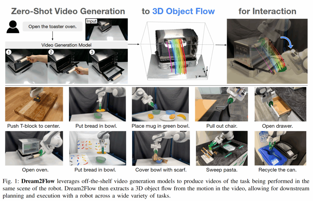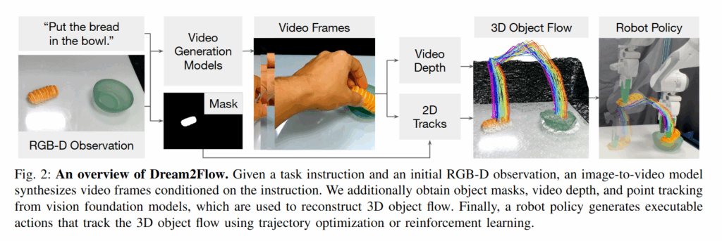 Dream2Flow의 방법론은 아래와 같이 비디오 생성, 3D object flow 추출, 로봇 policy 생성으로 구성됩니다. 딱히 복잡한 내용은 없습니다.