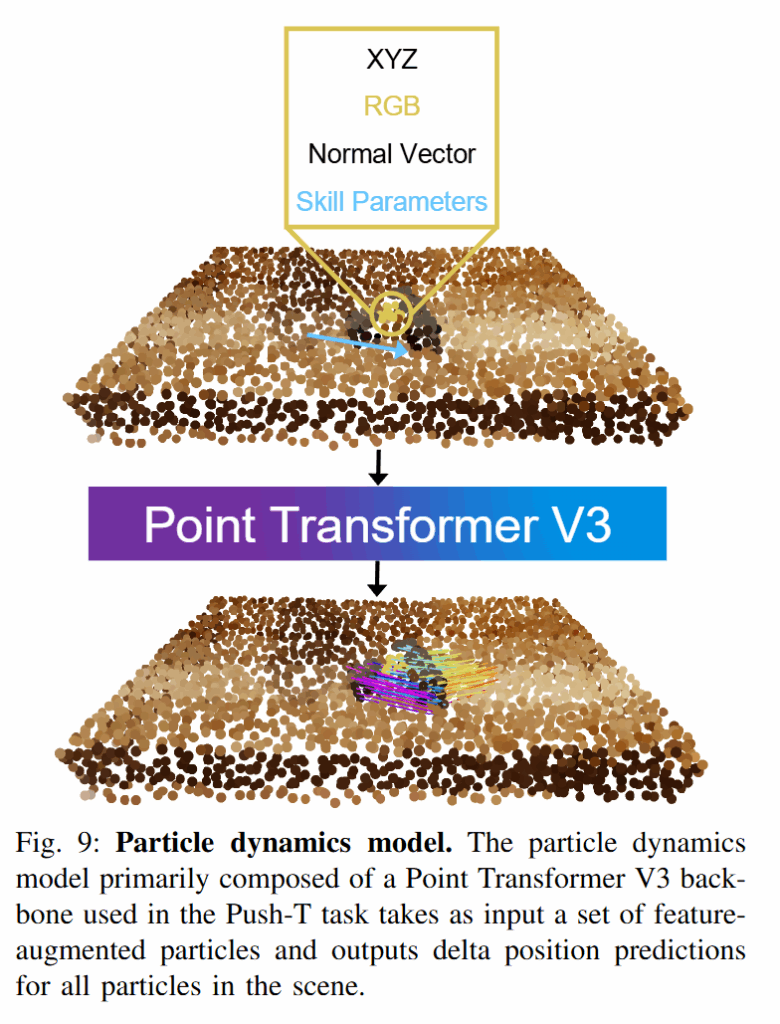 추출된 3D 객체 흐름을 실제 로봇이 따라가도록 만들기 위해, 저자들은 두 가지 전략을 상황에 따라 사용했습니다. 먼저 push T task에서는 open-loop 방식으로 물체를 직접 밀거나 미는형태의 조작에서 particle-based dynamics model과 random-shooting 플래너를 사용했습니다. Point Transformer 기반의 particle dynamics model을 사용하여 현재 물체 입자들의 상태와 가상 push 행동 파라미터를 입력 받아 다음 시점에서 입자들의 위치 변화를 출력합니다. 그런 다음 플래너가 여러 개의 푸쉬 후보를 시뮬레이션하여, 입자 모델이 예측한 결과로부터 목표 객체 흐름과의 오차를 계산합니다. 이 중 객체가 목표 궤적에 가장 잘 수렴하도록 만드는 행동을 선택하여 로봇의 다음 푸쉬 동작으로 실행했다고 합니다. 이러한 랜덤 슈팅 방식의 최적화는 객체의 회전도 입자들의 움직임으로 표현해 단순한 강체 모델보다 정확하게 물체의 연속적인 이동을 할 수 있었다고 합니다.